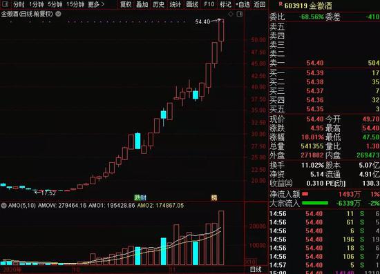 最近的白酒股比较吃香,短短1个多月时间,金徽酒从18元附近起步,暴涨了2倍,最新收盘价达54.40元。金徽酒最近三天股价有所加速,今日已是第三个涨停板。