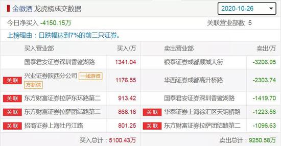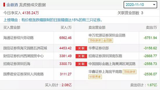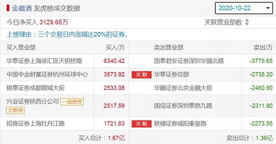 值得注意的是,华泰证券旗下几个营业部交易量较大。在金徽酒10月以来的龙虎榜数据中,华泰证券总部10月20日卖出1126.91万元,华泰证券总部10月22日龙虎榜数据显示,三个交易日里,其卖出2735.20万元(含10月20日卖出额)。华泰证券总部10月29日龙虎榜显示,其卖出2204.90万元。华泰证券总部11月10日龙虎榜显示,其卖出3158.62万元。11月11日的龙虎榜显示,其卖出5199.77万元(含11月10日卖出额),粗略计算,其累计卖出1亿元左右。华泰证券上海徐汇区天钥桥路证券营业部累计买入1亿左右,累计卖出5000多万元。