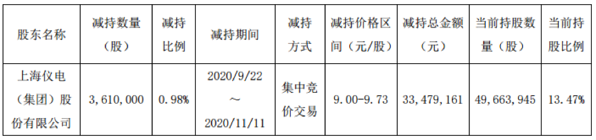 公告显示,仪电集团计划2020年9月22日~12月31日,通过集中竞价和大宗交易方式进行减持,拟减持不超过737.33万股公司股份,占公司总股本的2%。作为减持股东,仪电集团持有公司股份约占公司总股本的14.45%,则本次计划减持股份占其所持股份的比例约为14%。在减持的利空影响下,公司股价9月跌幅超10%。