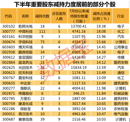 证券时报·统计显示,截至12日,下半年A股中重要股东所持股份遭遇净减持的个股数量多达1373只,超出去年同期数量。减持股主要分布在机械设备、医药生物、化工、电子、计算机行业中,分别有151只、143只、132只、127只、121只。