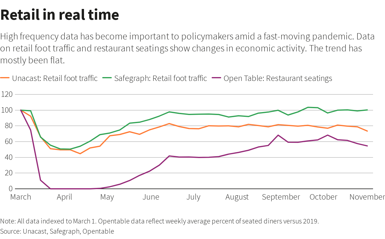 手机追踪公司Safegraph的数据则显示,零售场所的客流量充其量保持稳定。