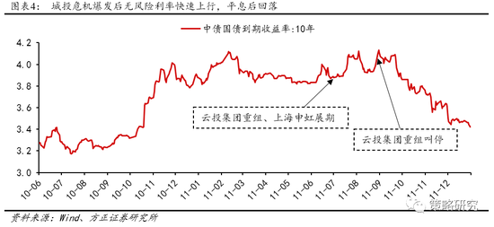2011年“城投债信用危机”始于4月云投集团发函,于6月云投集团重组、上海申虹展期事件的催化下爆发,8月云投集团重组暂停后逐渐平息。“四万亿“刺激以来城投激进融资导致债务风险堆积。2011年审计署第35号公告称地方政府债务超过10万亿,并提出地方政府举债及融资平台管理不规范等问题,并要求整改。4月云南路投公司被爆出向债权银行发函,表示只付息不还本,引发市场对于违约的担忧。6月30日云投集团重组得到证实,云南省政府拟将云投集团控股的云南电力投资有限公司账面资产与其持有的电力、煤炭资产整合。电力资产为云投集团最优资产,剥离其电力资产将使云投集团债券失去还款来源,被市场看作违约行为。同月28日上海银监局就上海申虹投资发展有限公司贷款一事召开协调会。媒体爆出公司已有近10亿元流动资金到期,部分出现逾期,需要展期并转换成以资产抵押的固定贷款。市场对于城投债违约担忧加剧,恐慌情绪引发市场大规模赎回开放式债券基金,4月至8月形成股债双杀局面,十年国债收益率由3.8%持续走高至4.0%,上证综指从3000点跌落至2500点。8月30日云南省政府被迫叫停了云投集团重组进程,信用危机事件逐渐平息。