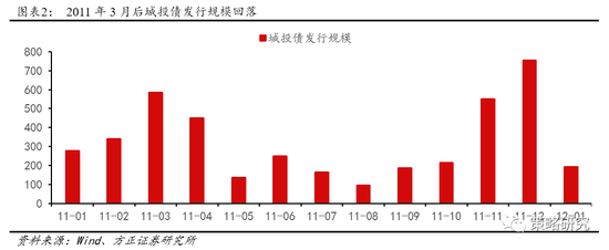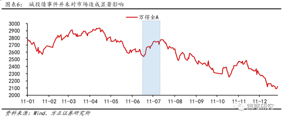 2011年一季度后市场开启震荡下行,城投债事件并未对市场造成显著影响。万得全A指数在4月15日见顶后开启震荡下行,6月20日至7月14日期间,市场小幅回升,城投债信用危机事件对指数并未造成明显杀伤,6月30日城投信用危机发生当天,万得全A涨幅1.29%,申万一级行业全部收涨,危机爆发的一个星期内,万得全A涨幅3.34%, 申万一级行业全部收涨。7月14日指数见顶后,市场一路下行,一个月内万得全A跌幅达到-6.71%, 申万一级行业除饮料外全部收跌,跌幅前三的行业为钢铁(-11.58%)、金融(-11.34%)和通信(-11.26%)。8月30日云投重组叫停后,难改市场下行态势,万得全A持续下跌。总体来看,城投危机的爆发和平息对市场走势影响并不显著。