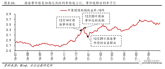 国海事件爆发初期无风险利率、信用利差快速上行,事件缓解后利率、信用利差短暂下行,但并未改变之后上升的大趋势。由于受到美国市场利率持续上行、货币市场利率波动性大幅增加、银行年底大量赎回基金产品、货币政策出现转向等一系列负面因素的涌现,从11月下旬开始,十债收益率就出现大幅抬升,到国海事件爆发前无风险利率已经上升了34个基点。国海事件的爆发加速了无风险利率的上行,从12月14日到12月20日,五个交易日内十年国债收益率从3.19%跃升至3.37%,上升幅度高达19个基点,这一时期也被债券投资者称为“债灾”。信用利差在这一时期也快速走扩,幅度达到12个基点。随着12月20日起国海事件出现转机,对市场的冲击也开始逐渐缓解,12月21日债券市场出现了久违的修复性上涨,10年国债收益率在当天下行9个基点。到12月末国海事件得到妥善解决后,10年国债收益率相比12月20日的高点出现了明显的下降,下降幅度高达36个基点。信用利差也在同一时期出现回落,到2017年1月初已经恢复至国海事件爆发前水平。由于进入2017年1月货币政策由松转紧,十年国债收益率重新回到上行通道,信用利差也从1月中旬起重新走扩,国海事件的妥善解决并未改变利率与信用利差上升的大趋势。