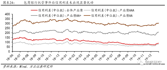 包商银行托管事件后监管及时,无风险利率先升后降,信用利差持续提升一个月后开始下行态势。包商银行托管事件发生前,1月至4月十年国债收益率受通胀走高和紧缩预期影响持续抬升。4月24日TMLF投放2674亿元后,流动性压力缓解,国债收益率见顶回落。事件发生的后一个交易日,十年国债收益率由3.31%升至3.35%。由于央行反应及时,4天内连续大额净投放6100亿元(含国库现金招标),十年国债收益率于28日开始持续下行。受事件影响,6月至7月中旬资金整体宽松,信用利差在6月至7月出现小幅回升后持续下行。全体企业债信用利差中位数5月24日91.1BP升至7月2日的100.6BP,随后开始下行态势,7月末恢复至包商银行托管事件前的水平。