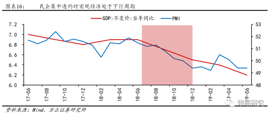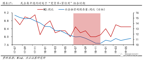 2018年下半年民企集中违约时处于“宽货币+紧信用”组合时期,宏观经济处于下行周期。从货币信用环境看,2018年下半年正处于宽货币、紧信用阶段。货币方面,在2018年4月央行货币政策由紧转松,标志性事件是央行降准置换中期借贷便利。7月政治局会议首次提出“六稳”,在政策层面进一步加强宽货币的信号。M2同比增速在这一时期也结束下行趋势开始出现小幅回升,基本稳定在8.2%的中枢水平。信用方面,由于金融监管加强、金融去杠杆仍在持续进行中,2018年下半年我国一直处于“紧信用”的状态,“紧非标、紧政府担保”为本轮紧信用的主要特征。社融同比增速其实从2017年10月起就进入了下行通道,在2018年12月下降到10.3%的历史新低。从经济层面看,2018年下半年民企集中违约时我国正处于经济的下行周期,经济增长中枢逐渐由7%下行至6%。制造业PMI也在2018年5月达到阶段性高点后开始下降,到12月制造业PMI已经处于荣枯线以下。