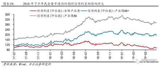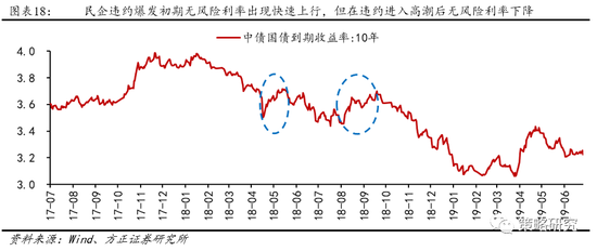 民企违约爆发初期无风险利率出现快速上行,但在民企违约进入高潮后对无风险利率影响不大。十年国债收益率在2018年1月见顶后就进入了下行通道,但在2018年全年十年国债收益率出现过两次短暂的上行区间,分别发生在4-5月和7-8月,这两段时间均是民企违约集中发生时期。2018年4月下旬至5月中旬富贵鸟、凯迪生态等公司的接连违约标志着本轮信用危机的初现端倪,特别是在4月央行实施降准后十年国债收益率依旧上行超过21个基点,随后由于民企违约现象的暂时缓解,十债收益率从5月下旬开始重新回到下行通道。2018年7月5日永泰能源的违约标志着民营企业信用违约开始集中爆发,这一时期无风险利率重新开始上行,在2个月的时间内上升超过23个基点。然而在9月下旬民企违约进入高潮后,无风险利率开始下降,表明民企债务爆雷的负面影响在边际递减。从信用利差看,在2018年3-7月信用利差经历大幅走扩后,在民企违约爆发的高峰(金麒麟分析师)期信用利差并未出现明显波动,同样证明了民企债务爆雷的负面影响在下降。