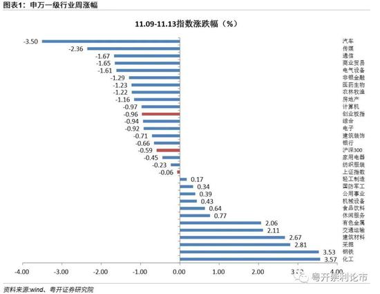 11月9日-11月13日当周,市场风格有所分化,板块轮番表现。经历了周一的普涨之后,周二、周三周期类品种及以白酒为代表的消费股表现活跃,周四、周五创业板指和科创50指数表现更优。从周涨幅来看,低估值顺周期板块优势更为突出,化工、钢铁、采掘板块领涨,前期活跃的汽车板块回调明显。