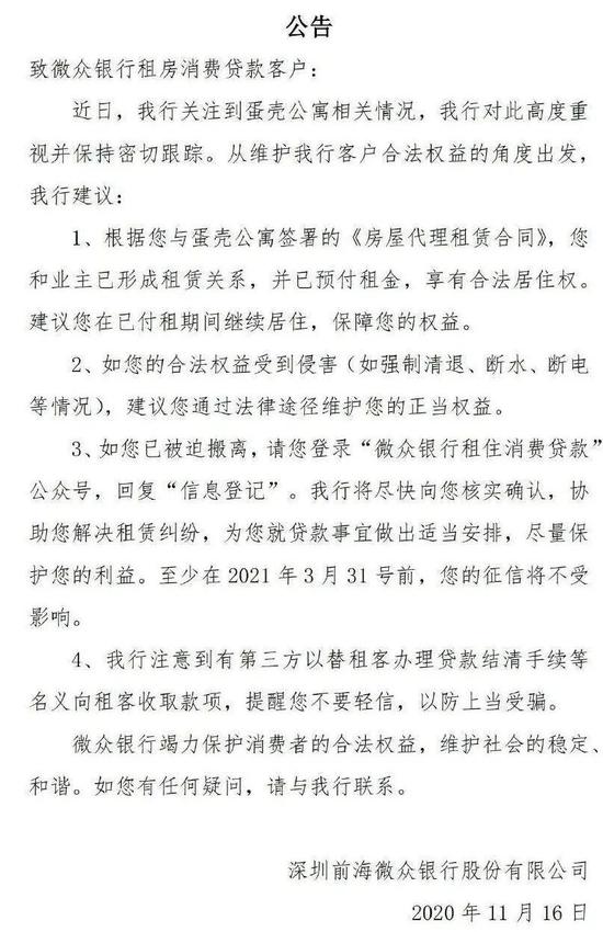 下午15点左右,微众银行正式发布公告,为租客解惑并提供建议。