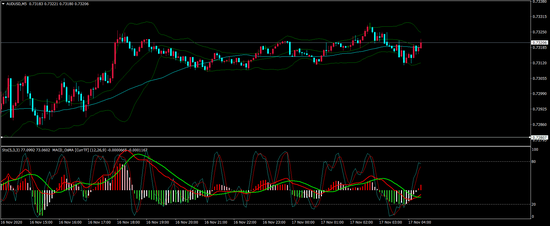 5M:昨日突破0.7270一线偏多,至收盘涨势缓和,目前震荡指标趋于超买,日内下方关注4H前支撑,短线逢低做多。
