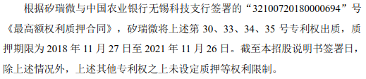 但依据力芯微2018年收购的“矽瑞微”与中国农业银行无锡科技支行签署的“32100720180000694”号《最高额权利质押合同》可知,矽瑞微将4项专利权出质(参考力芯微招股说明书“五、主要固定资产和无形资产等资源要素-(二)主要无形资产情况-2、专利权”所记载的第30、33、34、35号专利权),质押期限为2018年11月27日至2021年11月26日,占公司专利总数的11.42%。