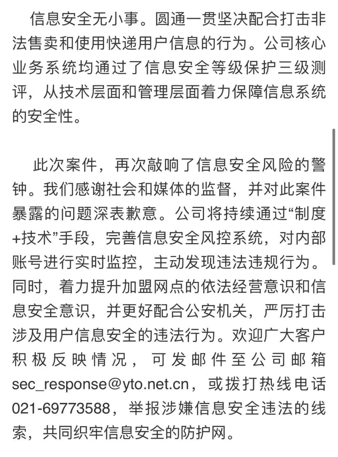 圆通称,“此次案件,再次敲响了信息安全风险的警钟。公司感谢社会和媒体的监督,并对此案件暴露的问题深表歉意。”