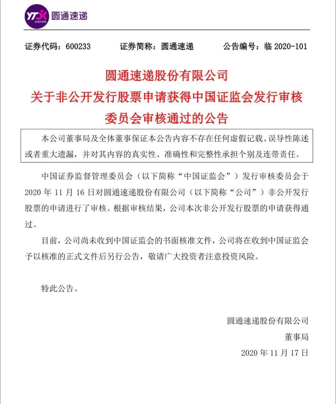 16日晚,圆通速递(600233)发布公告称,2020年11月16日,中国证监会发审委对公司非公开发行股票的申请进行了审核。据审核结果,公司本次非公开发行股票的申请获得通过。