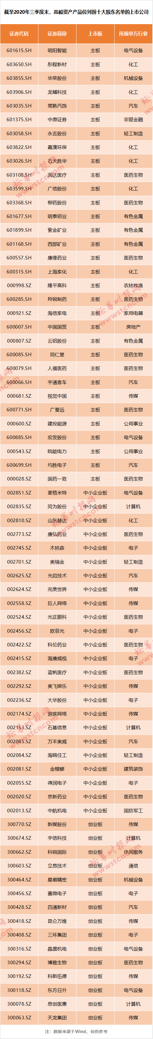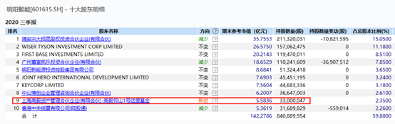 上述公司中,主板公司有32家,中小板公司有24家,创业板公司有15家。比如2020年三季度末,高毅邻山1号远望基金持有3300万股明阳智能的股票,持股市值达到5.58亿元。