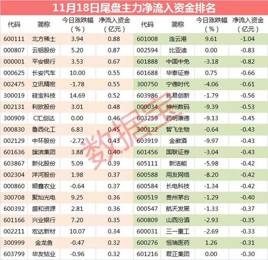 从个股尾盘资金流向数据看,有6股尾盘净流入资金超过5000万元,北方稀土、云铝股份、平安银行等个股尾盘资金净流入金额最多,分别高达0.88亿元、0.87亿元、0.67亿元;连云港、比亚迪、中国中免等个股尾盘资金净流出金额最多。