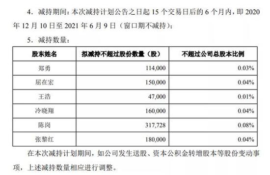 公司今日发布的公告显示,董事郑勇、监事屈在宏、王浩以及高级管理人员冷晓翔、陈岗、张黎红计划自本公告之日起15个交易日后的6个月内以集中竞价方式减持各自持有的部分公司股份。记者统计显示,此次公司高管合计拟减持股份968728股,按照今日收盘价计算,合计金额约3264万元。