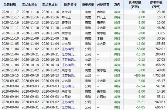 Wind数据统计显示,自8月31日开始,公司三季度第一大流通股东江苏瑞元投资有限公司在短短2个半月内先后进行了8次减持,累计696.96万股,合计参考市值8510万元。此外,公司高管许曰玲、宋志刚、丁锋等人在此期间也先后进行了11次减持,累计63.4万股,合计参考市值654.6万元。