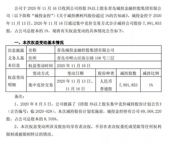 青岛城投金融控股集团有限公司的这一波减持是2020年8月5日披露的减持计划的一部分。该减持计划显示,城投金控将于2020年8月27日至2020年11月24日期间,以集中竞价方式减持不超过7,991,800股通过非公开发行取得的公司股份,不超过公司总股本的1%;以集中竞价方式减持通过集中竞价交易取得的股份不超过21,618,400股,不超过公司总股本的2.71%。