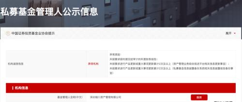 在基金业协会网站上显示,瑞川资产的机构信息最后更新时间为2018年6月,同时瑞川资产已被列入异常机构。主要原因为,未按要求按时提交经审计的年度财务报告;未按要求进行产品更新或重大事项更新累计2次及以上(资产管理业务综合报送平台相关信息更新事宜);未按要求进行产品更新或重大事项更新累计2次及以上(私募基金信息披露备份系统相关信息披露报告备份事宜)。