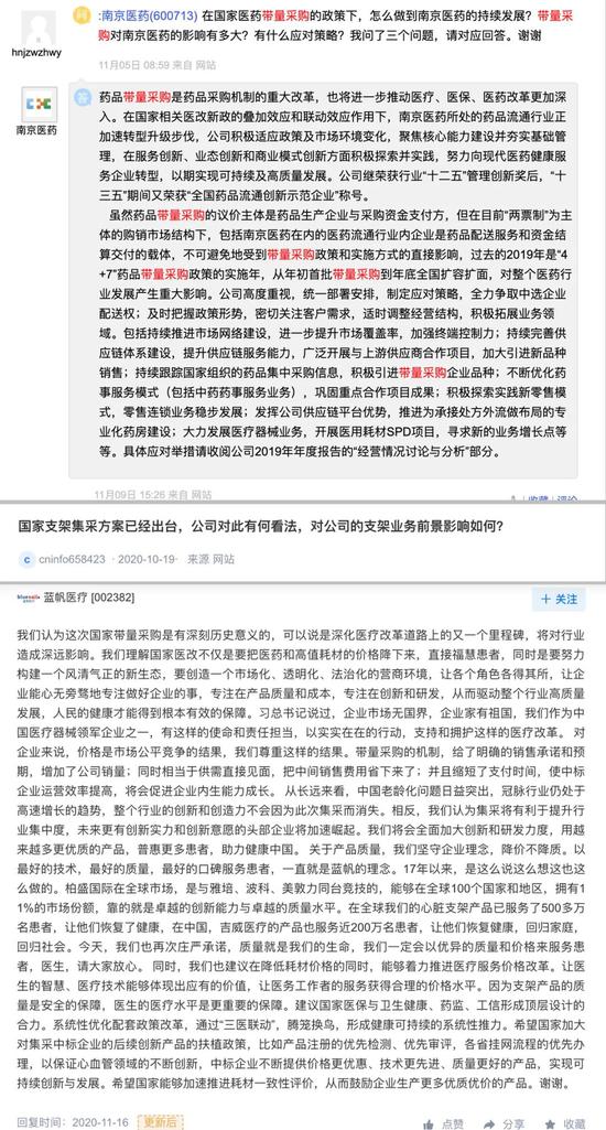 不少公司表示,目前的政策频出,且公司对此始终高度关注,并积极准备。但是,截至目前,公司主营产品还未囊括到带量采购范围内。