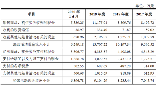 招股书显示,公司2017年-2019年经营活动产生的现金流量净额分别为2550.78万元,1961.90万元、4602.92万元。