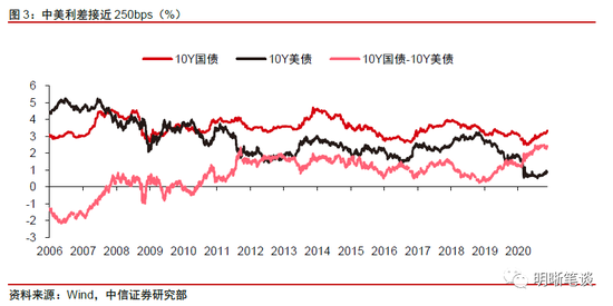 中美利差上行至接近250bps。随着国内利率近期的上行,中美利差进一步扩大。截至11月19日,10年期国债收益率上行到3.34%,而美债利率近期有所下行,到了0.86%的水平,中美利差已然达到248%bps,达到了历史最高的水平附近。