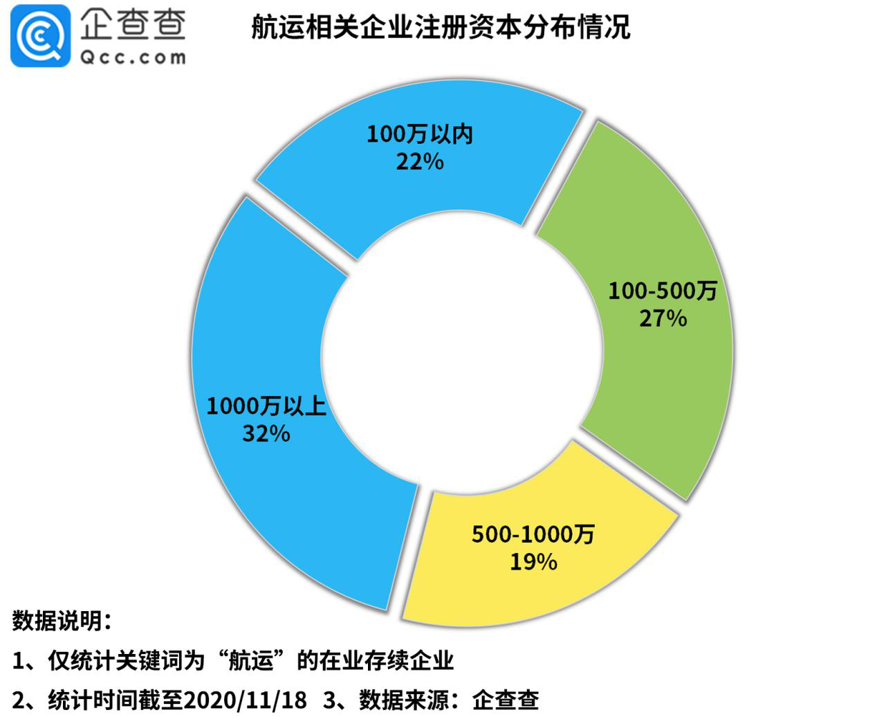 从注册资本来看,企查查数据显示,我国近5成的航运相关企业注册资本都集中在500万以内,其中22%的企业注册资本在100万以内,27%的企业注册资本在100万-500万这个区间,而注册资本在1000万以上的则占总量的32%。