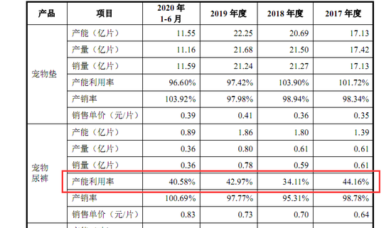 而公司主打的宠物尿裤,产能利用率仅有40%左右,连一半都不到。
