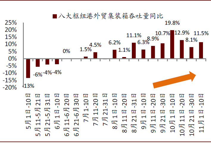 11月20日当周集运运价延续上涨势头(SCFI综合指数环比+4.4%,欧线上涨9%,美西线微涨0.7%)。我们预计大客户对明年一季度合同价谈判提价的接受度会更高。