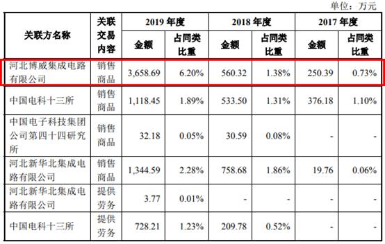 招股书披露,2017年至2019年,中瓷电子向关联方博威集成的销售金额分别为250.39万元、560.32万元和3658.69万元,增长明显。