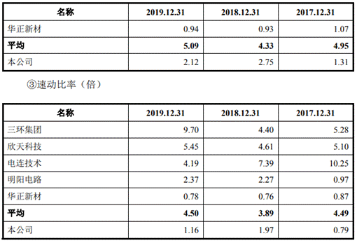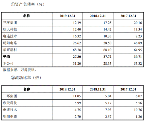 上述同期,可比公司的资产负债率均值分别为35.18%、30.71%、27.72%和27.30%,流动比率均值为3.60、4.95、4.33和5.09,速动比率均值分别为3.17、4.49、3.89和4.50。