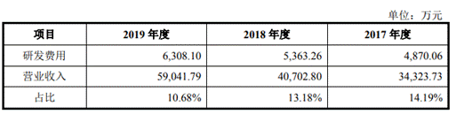 2016年、2017年、2018年、2019年,中瓷电子的研发费用分别为4577.73万元、4870.06万元、5363.26万元和6308.10万元,研发费用率分别为19.79%、14.19%、13.18%、10.68%。