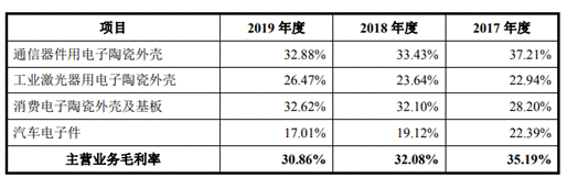 上述同期,公司第一大业务——通信器件用电子陶瓷外壳毛利率从2016年的40.37%跌至2019年的32.88%,第二大业务——汽车电子件毛利率则从2016年的20.51%跌至2019年的17.01%。