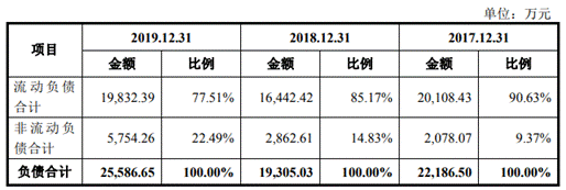 2016年至2019年各期末,中瓷电子的负债分别为14,265.30万元、22,186.50万元、19,305.03万元和25,586.65万元,其中流动负债分别为11,842.03万元、20,108.43万元、16,442.42万元和19,832.39万元,占比83.01%、90.63%、85.17%及77.51%。