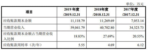 2016年至2019年各期末,中瓷电子的应收账款期末余额分别为4837.07万元、7053.14万元、11,269.69万元和11,118.79万元,占当期营业收入的20.91%、20.55%、27.69%和18.83%。