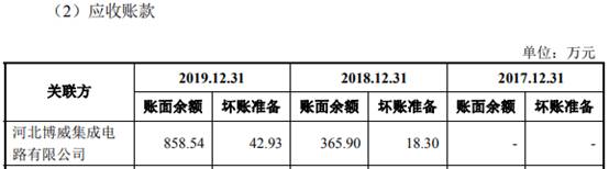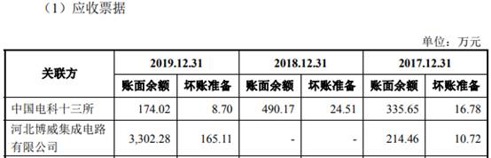 另外,2017年至2019年,中瓷电子对博威集成的应收票据账面余额分别为214.46万元、0元、3302.28万元,坏账准备10.72万元、0元和165.11万元。公司对博威集成应收账款账面余额分别为0元、365.90万元、858.54万元,坏账准备0元、18.30万元和42.93万元。