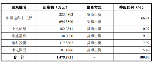 招股书披露,中瓷电子的控股股东为中国电子科技集团公司第十三研究所(简称中国电科十三所),持有公司66.24%的股份。中国电子科技集团公司(简称中国电科)通过中国电科十三所、电科投资和中电国元间接控制公司79.69%的股份,是中瓷电子的实际控制人。