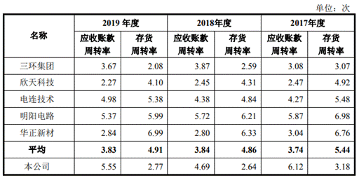 2016年至2019年各期末,中瓷电子的应收账款周转率分别为5.36、6.12、4.69和5.55,同期行业可比公司的应收账款周转率均值分别为3.95、3.74、3.84和3.83。