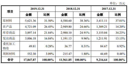 2016年至2019年各期末,中瓷电子的存货账面价值分别为4931.9万元、9216.64万元、11,961.85万元和17,847.87万元,占总资产的比例分别为17.92%、22.98%、17.57%和21.76%。