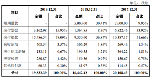 其中,2016年至2019年各期末,中瓷电子应付账款余额分别为8112.59万元、10,387.17万元、9350.60万元及15,486.54万元,占流动负债比例分别为68.51%、51.66%、56.87%及78.09%,主要为应付材料款、基建款和设备购置款。
