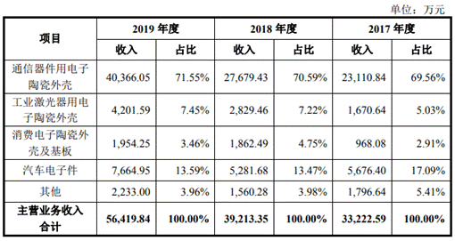 但2016年至2019年,公司来自消费电子陶瓷外壳及基板的销售收入分别为142.31万元、968.08万元、1862.46万元、1954.25万元,占当期营业收入的比重分别为0.62%、2.91%、4.75%和3.46%,占比较低。