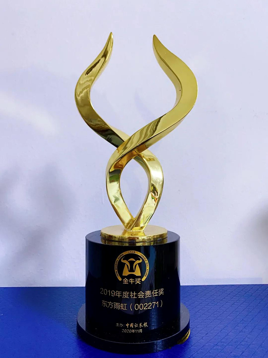 11月19日,由中国证券报、海口市人民政府联合主办的“2020上市公司高质量发展论坛暨第22届上市公司金牛奖颁奖典礼”在海口举行,东方雨虹(ORIENTAL YUHONG)荣获年度金牛社会责任奖。