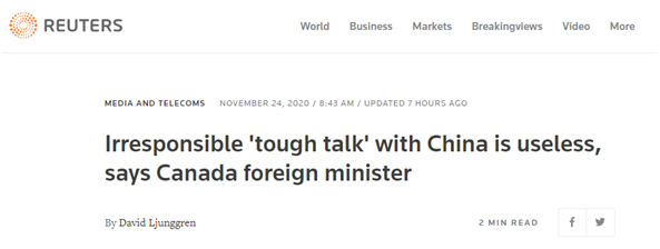 路透社:加拿大外长称对中国(发表)不负责任的“强硬言论”是没有用的
