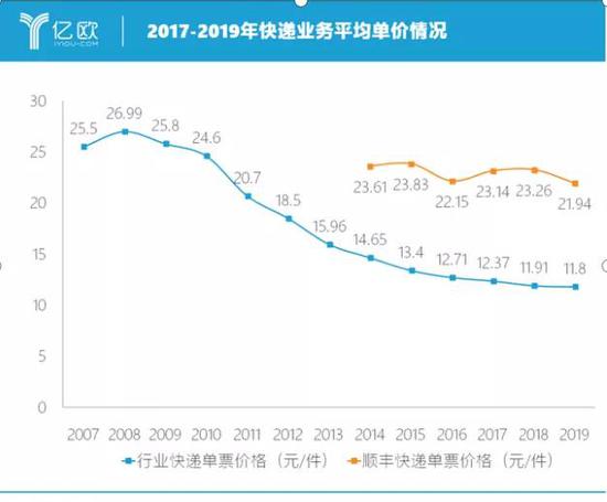 财务数据显示,2019年顺丰的票均收入为21.94元,比上年同期23.26元下滑了1.32元。