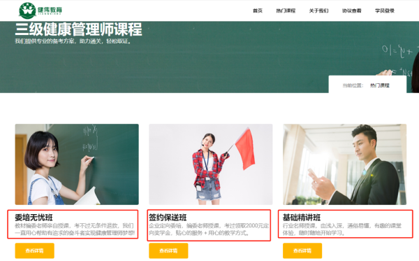 健伟教育官网此外,健伟教育官网的“热门课程”显示,有“基础精讲班”、“委托无忧班”、“签约保送班”3中课程类型。其中,“委托无忧班”的介绍显示,该班型是教材编委老师亲自授课,考不过无条件退款;“签约保送班”的介绍显示,该班型是企业定项委培,编委老师授课,考过领取2000元定向奖学金。