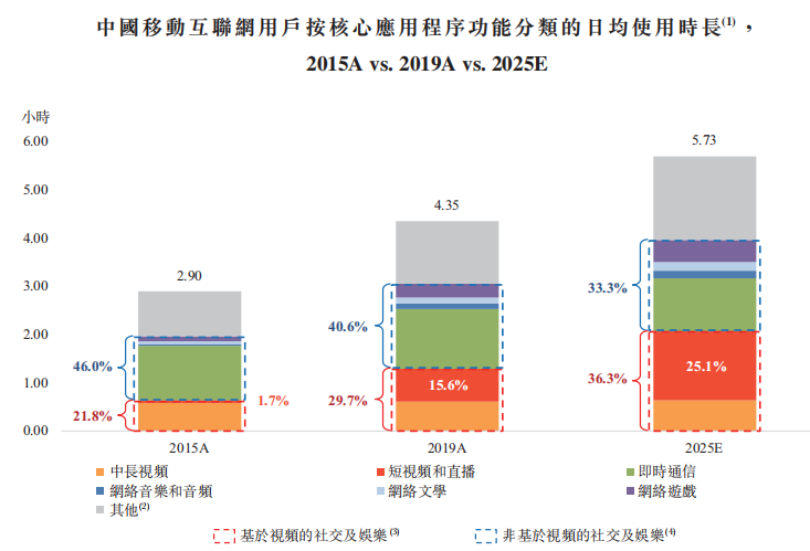 艾瑞咨询数据显示,中国移动互联网用户日均使用时长,2015年和2019年分别为2.90小时和4.35小时,2025年将会达到5.73小时。其中,中长视频日均使用时长占比分别为20.1%、14.1%、11.2%,逐渐降低;短视频和直播日均使用时长占比显著提高,分别为1.7%、15.6%、25.1%。
