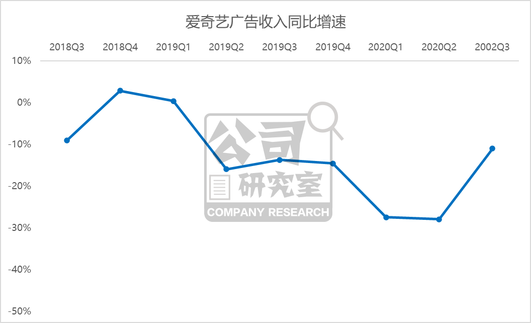 在爱奇艺的收入结构中,广告占比曾一度超过50%。然而,2018年Q3以来的9个季度,广告收入增速从未超过10%,且连续6个季度同比增速是负的。
