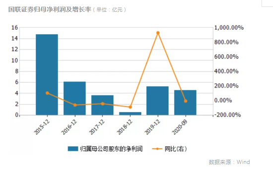 国联证券重组国金证券被质疑的问题之一就是不仅国联证券体量小于国金证券,业绩增长也不如国金证券。