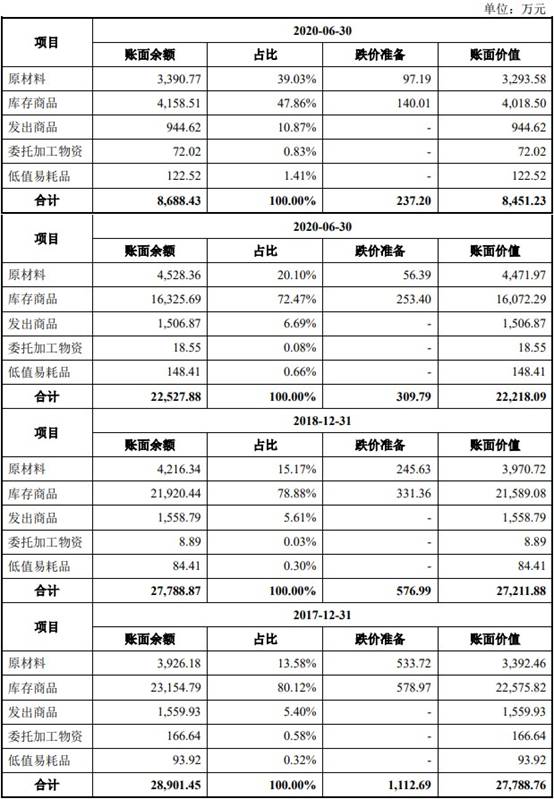 欢乐家的存货主要为原材料、库存商品等。报告期各期末,欢乐家存货账面余额分别为2.89亿元、2.78亿元、2.25亿元、8688.43万元;存货账面价值分别为2.78亿元、2.72亿元、2.22亿元和8451.23万元,占公司流动资产比例分别为50.76%、50.09%、40.44%和21.92%。