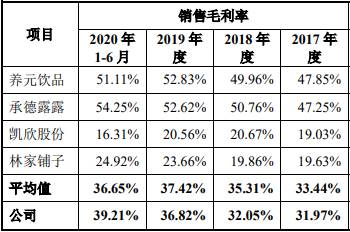 2017年至2020年1-6月,欢乐家的毛利率分别为31.97%、32.05%、36.82%、39.21%,同行业公司平均值分别为33.44%、35.31%、37.42%、36.65%。